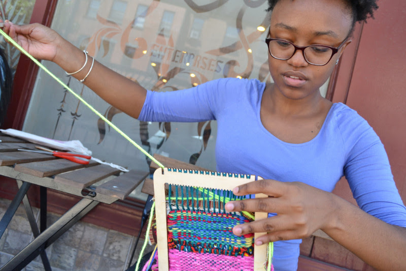 Then guest teacher Tyler showed us how to weave on a frame loom! We created beautiful tapestries that incorporated different materials, while learning about where each type of material comes from.